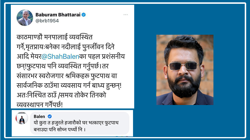 पूर्वप्रधानमन्त्री डा.भट्टराईले आफ्नो ट्वीटरमा काठमाडौं महानगरको कामको प्रसंशा गर्दै अव्यवस्थित फुटपाथबाट हटाइएकालाई चाहिँ व्यवस्थापन गर्न अनुरोध गरेको कुरालाई मेयर बालेनले जवाफ दिदै यस्तो तुच्छ बोलेका हुन् ।