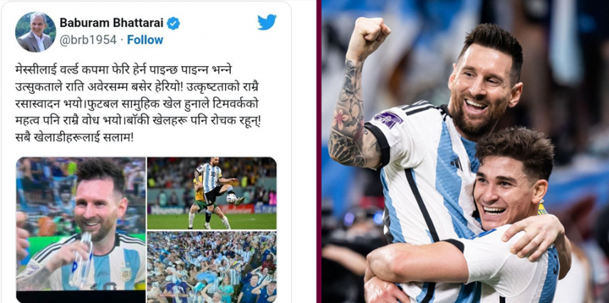 शनिबार रातिको खेल हेरेपछि डा.बाबुराम भट्टराईले ट्वीट गर्दै लेखेका छन्-‘मेस्सीलाई वर्ल्ड कपमा फेरि हेर्न पाइन्छ कि पाइन्न भन्ने उत्सुकताले राती अवेरसम्म बसेर हेरियो’