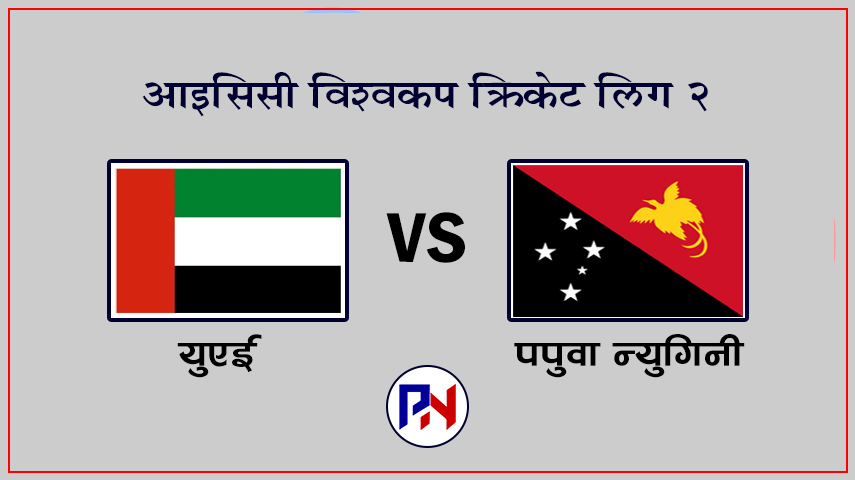 काठमाडौं, १६ फागुन । आइसीसी क्रिकेट विश्वकप लिग टु अन्तर्गत युएई, नेपाल र पपुवा न्युगिनी (पिएनजी) सम्मिलित त्रिकोणात्मक श्रृंखलामा आज युएई र पिएनजी खेल्दै छन् ।