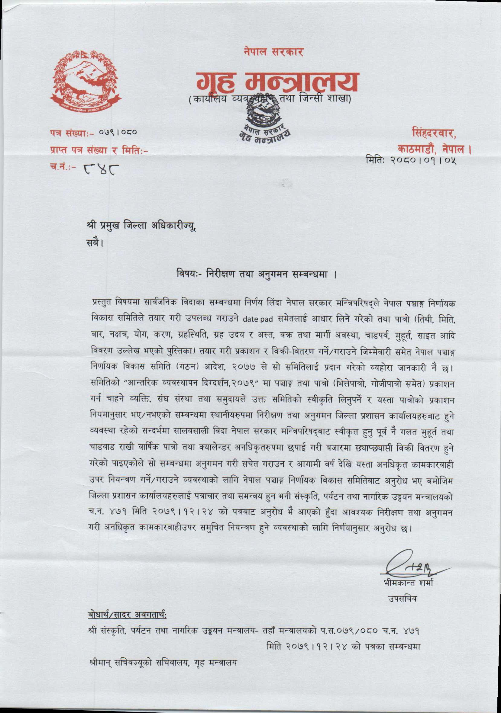 पात्रो, भित्तेपात्रो र गोजीपात्रो प्रकाशन गरी बिक्री, वितरण गराउने काम समितिको गठन आदेश, २०७७ मा उल्लेख भएकाले अनधिकृतरूपमा स्वीकृति नलिई प्रकाशन भएका पात्रो, भित्तेपात्रो र गोजीपात्रोलाई कारबाही गर्न मन्त्रालयले परिपत्र गरेको हो ।