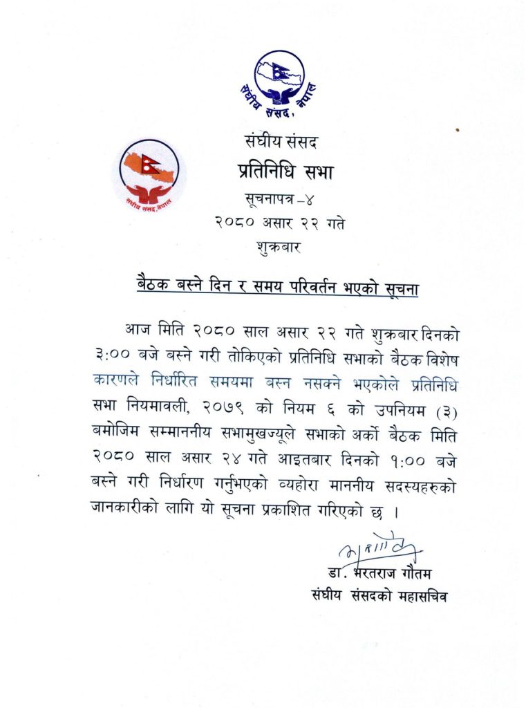 शुक्रबार बसेको कार्यव्यवस्था परामर्श समितिको बैठकमा प्रमुख प्रतिपक्षी नेकपा एमालेले प्रधानमन्त्रीको राजीनामा आउनुपर्ने अडान नछाडेपछि संसद बैठक बस्दै नबसी स्थगित भएको हो ।