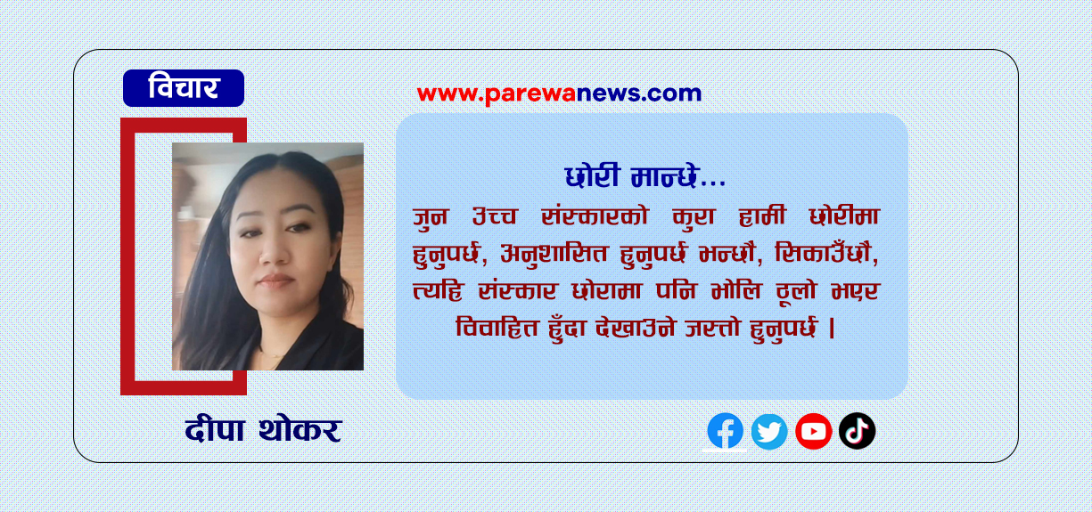 समाजमा के देखिन्छ भने बुवा र आमाले पनि पितृसत्तात्मक साेच अनुसार छाेराले भाेली घरबाट बाहिर कमाएर घर-परिवार पाल्नुपर्ने “बाहिरिया outsider” बन्नुपरेकाेले बहादुर/नीर्भिक बन्नुपर्छ साेच्छाैं तर छाेरीले घरमा बसेर रह्नुपर्छ, विहेलाई राम्राे केटा चाहिन्छ भनेर उनलाई “भित्रिया insider” साेचेर बिस्तारै बाेल्न, सभ्य बाेल्न, चर्काे नबाेल्न र “राम्री केटी good girl” बन्न साैन्दर्यका सामानहरू दिन्छाैं, जवाफ नफर्काउन सिकाउँछाैं ! अर्थात्, “सभ्यता र सुन्दरता” काे नाउँमा उनकाे जिब्रो काटेर लाटी बनाउँछाैं हामी जबकि दिमाग उनकाे चलिरहेकाे हुन्छ ।
