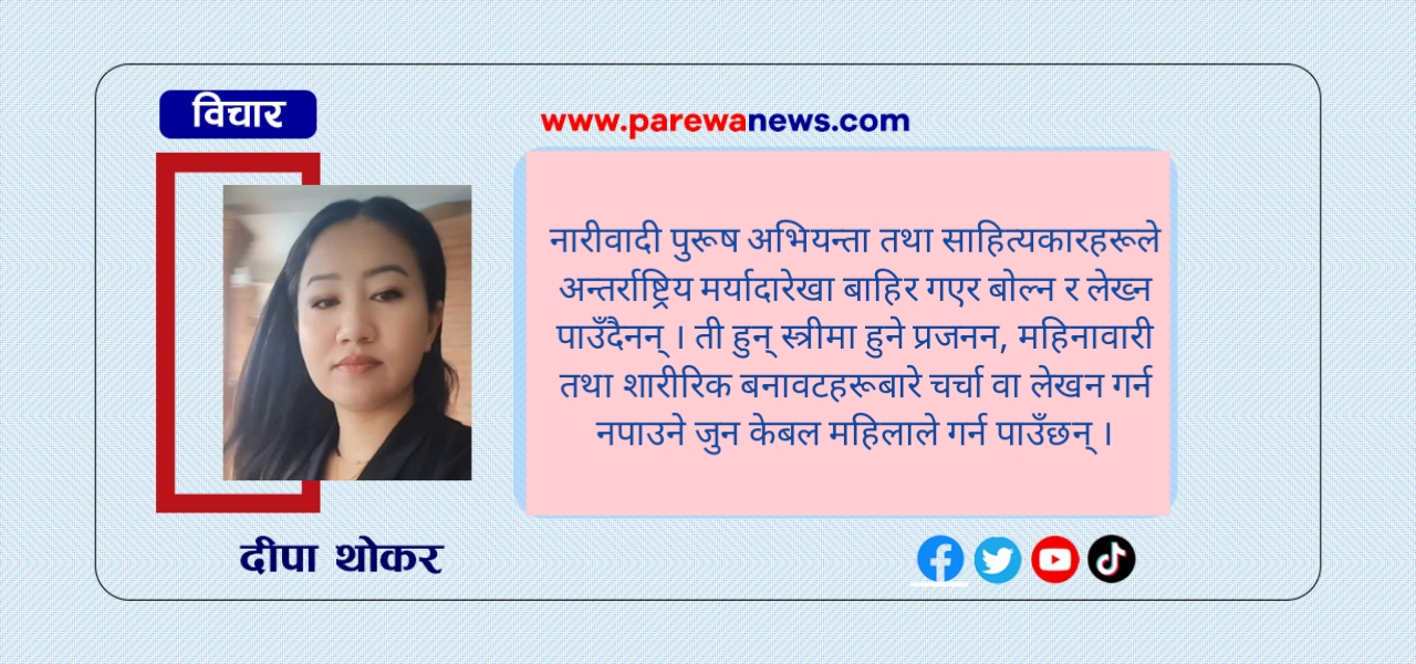 त्यस्तै, सबै पुरूष महिलाका शत्रु हुँदैन जस्तै कि प्राध्यापक सञ्जीव उप्रेतीका महिलामैत्री सकारात्मक साेच पढ्न पाईन्छ भने मेराे श्रीमान्ले मेराे कार्यमा सहयाेग गर्नुहुन्छ अनि पुरूष काेहिले मेरा लेखनलाई सम्पादन तथा प्रकाशनमा सहयाेग गर्नुहुन्छ भने आमासँग साैभाग्यवश मेराे बुवापनि उत्प्रेरणा दिनुहुन्छ । तर नारीवादी पुरूष अभियन्ता तथा साहित्यकारहरूले अन्तर्राष्ट्रिय मर्यादारेखा बाहिर गएर बाेल्न र लेख्न पाउँदैनन् । ती हुन् स्त्रीमा हुने प्रजनन, महिनावारी तथा शारीरिक बनावटहरूबारे चर्चा वा लेखन गर्न नपाउने जुन केबल महिलाले गर्न पाउँछन् ।