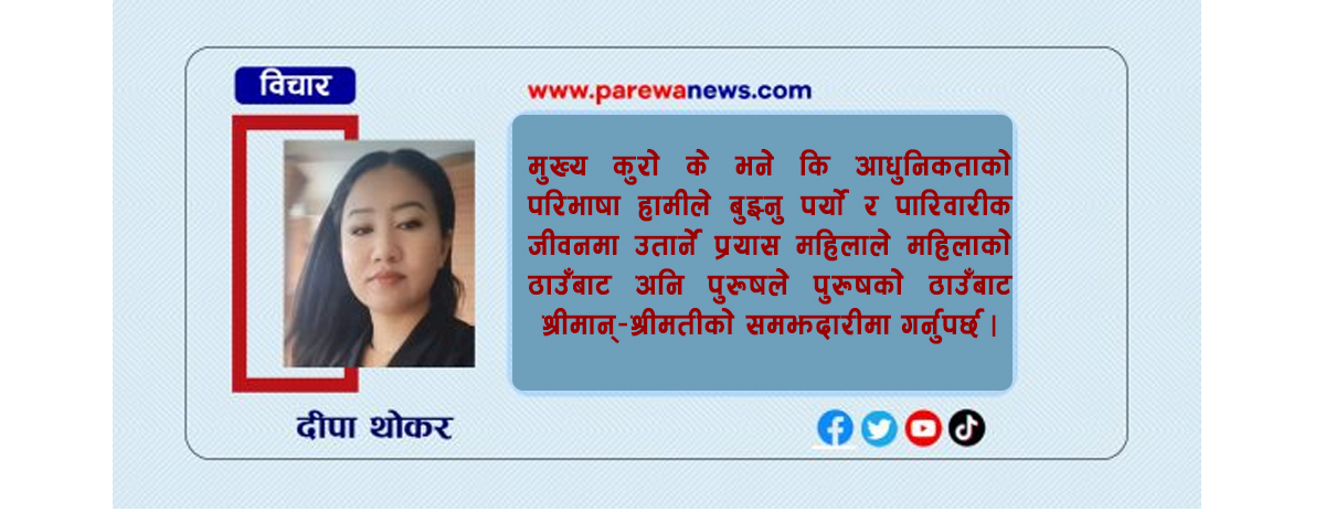 मुख्य कुराे के भने कि आधुनिकताकाे परिभाषा हामीले बुझ्नु पर्याे र पारिवारीक जीवनमा उतार्ने प्रयास महिलाले महिलाकाे ठाउँबाट अनि पुरूषले पुरूषकाे ठाउँबाट श्रीमान्-श्रीमतीकाे समझदारीमा गर्नुपर्छ । आधुनिकताकाे अर्थ पुराना सभ्यता, रीतिथिति अमूल्य परम्परालाई त्यागेर सडकमा जंगली जनावरले हिंडिरहेकाे जस्ताे बन्नु हाेईन अपितु काम गर्ने तरीका, साेच्ने तरीका, व्यक्तित्व विकास आदि कुरा नाैलाे हुनु हाे । आधुनिकताकाे अर्थ पाेषक पदार्थ खान छाेडेर जंक र कन्फेक्शनरी फूड (चाउमिन, चाउचाउ, केक, पाउराेटी, बिस्कुट, चक्लेट आदि) मात्र खाएर विरामी परेर मृत्युवरण गर्नु हाेईन जस्तै कि केही वर्ष अघिमात्र राैतहटका एकजना विद्यार्थी भाई अरूण यादबले काठमाडाैंकाे अनामनगरस्थित प्रमियम कलेजमा स्नातक पढ्दा भात, राेटी, मकैका परिकार केही नखाई मात्र जंक र कन्फेक्शनरी फूड खाएर रगत नबन्ने एक प्रकारकाे क्यान्सर जस्ताे राेगले ग्रसित भई काठमाडाैंका वीर, निजामति, अन्नपूर्ण, जाेरपाटी आदि अस्पतालबाट दिल्लीकाे एम्समा भर्ना हुँदापनि बाँच्न पाएन !