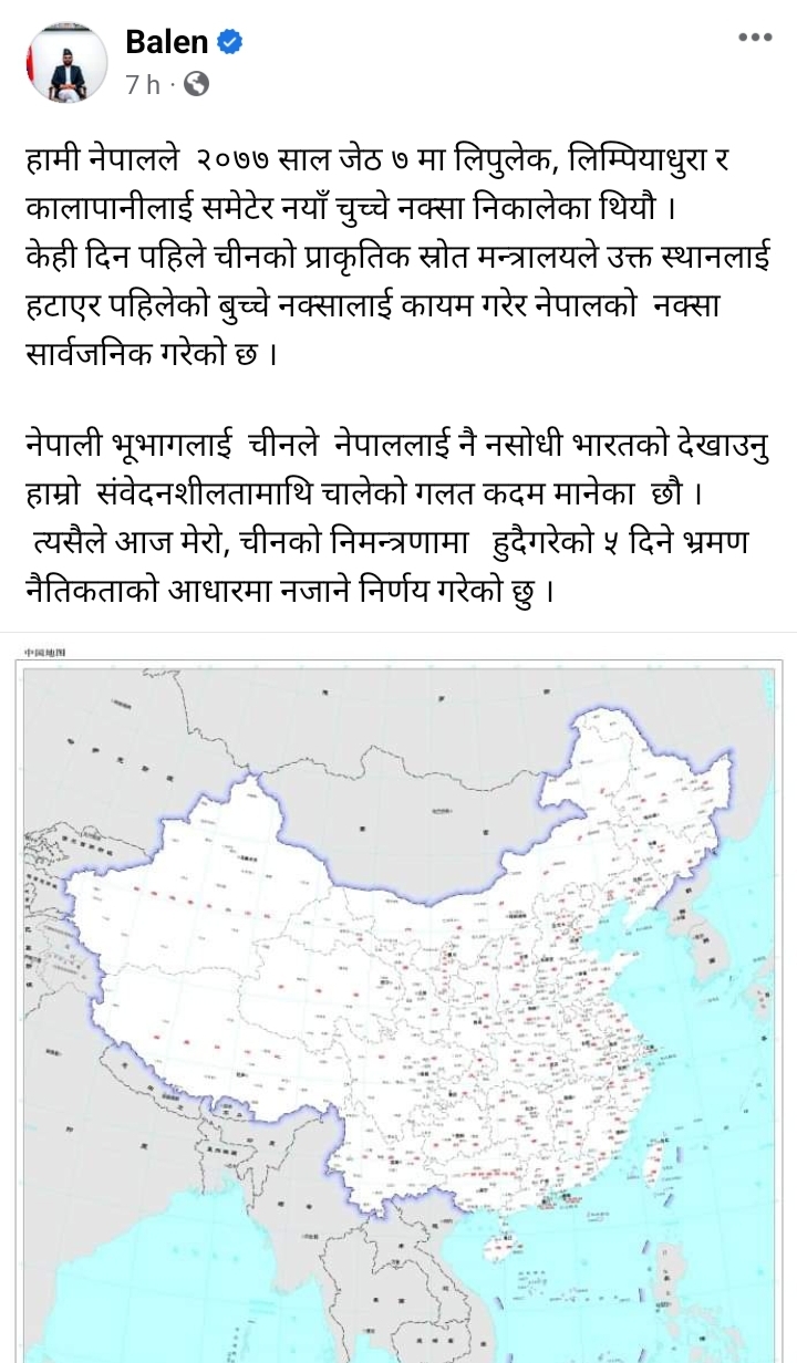 आफ्नो सामाजिक संजाल फेसबुकमा बालेनले लेखेका छन्हा-‘हामी नेपालले २०७७ साल जेठ ७ मा लिपुलेक, लिम्पियाधुरा र कालापानीलाई समेटेर नयाँ चुच्चे नक्सा निकालेका थियौ ।
