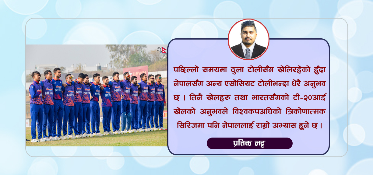 नेपालसँग विश्व क्रिकेटको हस्ती भारतसँग खेलेको अनुभव छ । पछिल्लो समयमा ठुला टोलीसँग खेलिरहेको हुँदा नेपालसँग अन्य एसोसियट टोलीभन्दा धेरै अनुभव छ । तिनै खेलहरु तथा भारतसँगको टी२०आई खेलको अनुभवले विश्वकपअघिको त्रिकोणात्मक सिरिजमा पनि नेपाललाई राम्रो अभ्यास हुने छ ।