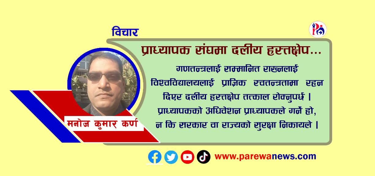 सरकारले बुझ्नुपर्छ कि गणतन्त्रलाई सम्मानित राख्नलाई विश्वविद्यालयलाई प्राज्ञिक स्वतन्त्रतामा रह्न दिएर दलीय हस्तक्षेप तत्काल राेक्नुपर्छ । प्राध्यापककाे अधिवेशन प्राध्यापकले गर्ने हाे, न कि सरकार वा राज्यकाे सुरक्षा निकायले ।