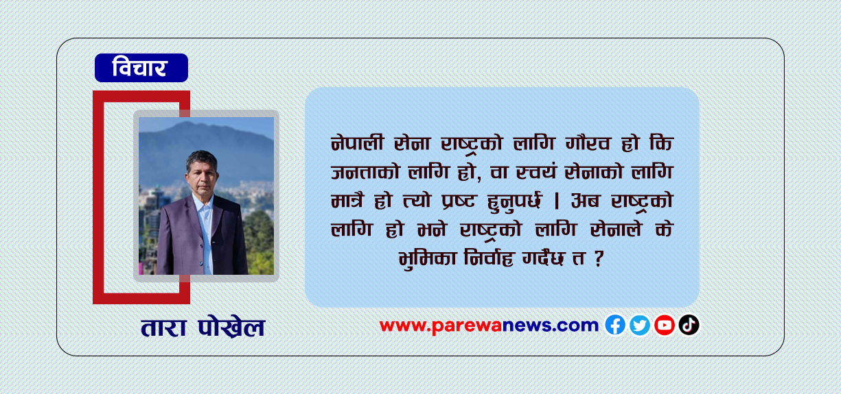 हाम्रो देशको सेनाबारे केही भन्न र लेख्‍न मन लाग्यो । पहिले शाही नेपाली सेना र गणतन्त्र पछि नेपाली सेना भनिएको यो संस्थालाई आजभोलि राष्ट्रिय गौरव समेत भनिन्छ । तर, नेपाली सेना राष्ट्रको लागि गौरव हो कि जनताको लागि हो ? वा स्वयं सेनाको लागि मात्रै हो त्यो प्रष्ट हुनुपर्छ । अब राष्ट्रको लागि हो भने राष्ट्रको लागि सेनाले के भुमिका निर्वाह गर्दैछ त ? के देशको सिमानामा बसेर सिमाको सुरक्षा गरेको छ ? के देशमा हुने बाह्य हस्तक्षेप या लडाइमा विदेशी सेनासँग लड्न सक्छ ?