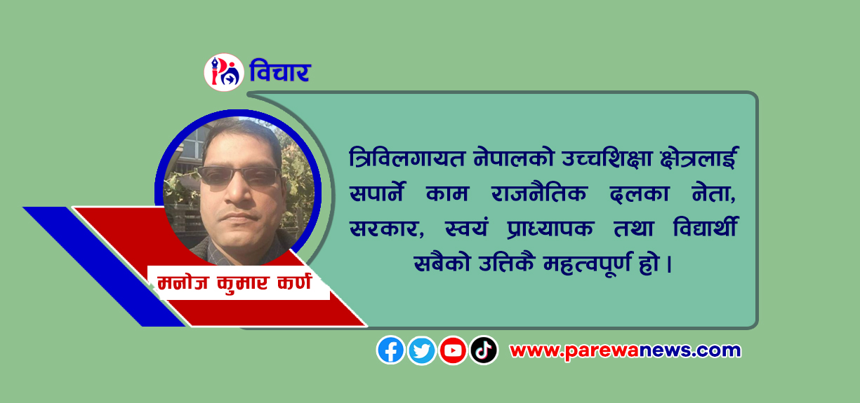 त्रिविलगायत नेपालकाे उच्चशिक्षा क्षेत्रलाई सपार्ने काम राजनैतिक दलका नेता, सरकार, स्वयं प्राध्यापक तथा विद्यार्थी सबैकाे उत्तिकै महत्वपूर्ण हाे । तर देशका हरेक आर्थिक, शैक्षिक, सामाजिक आदि वातावरणकाे अभिभावक राजनैतिक वातावरण नै भएकाेले राजनैतिक दलकाे मुहान, सरकारमा बस्ने मानिसकाे मुहान शुद्ध र सफा हुनुपर्छ । आज वा भाेली नै नगएर काेहि कुपतिज्यूले म त्रिवि वा विश्वविद्यालयबाट भागबन्डा हटाउँछु भन्ने तर त्रिविकाे भिसिमा भाषण र गफ्फमा “उच्च नैतिकता” देखाउनेजस्ताे गरेर यता भिसि नियुक्ति नगरि हाेल्ड गरेर उता बाँकी युनिवर्सिटिज्तिर बढीभन्दा बढी नेतृत्वकाे भागबन्डा स्वयंकाे वैचारिक प्राध्यापक संगठनले ताकेर बस्दा भन्ने द्वैध चरित्र (dual character) चल्दैन ।