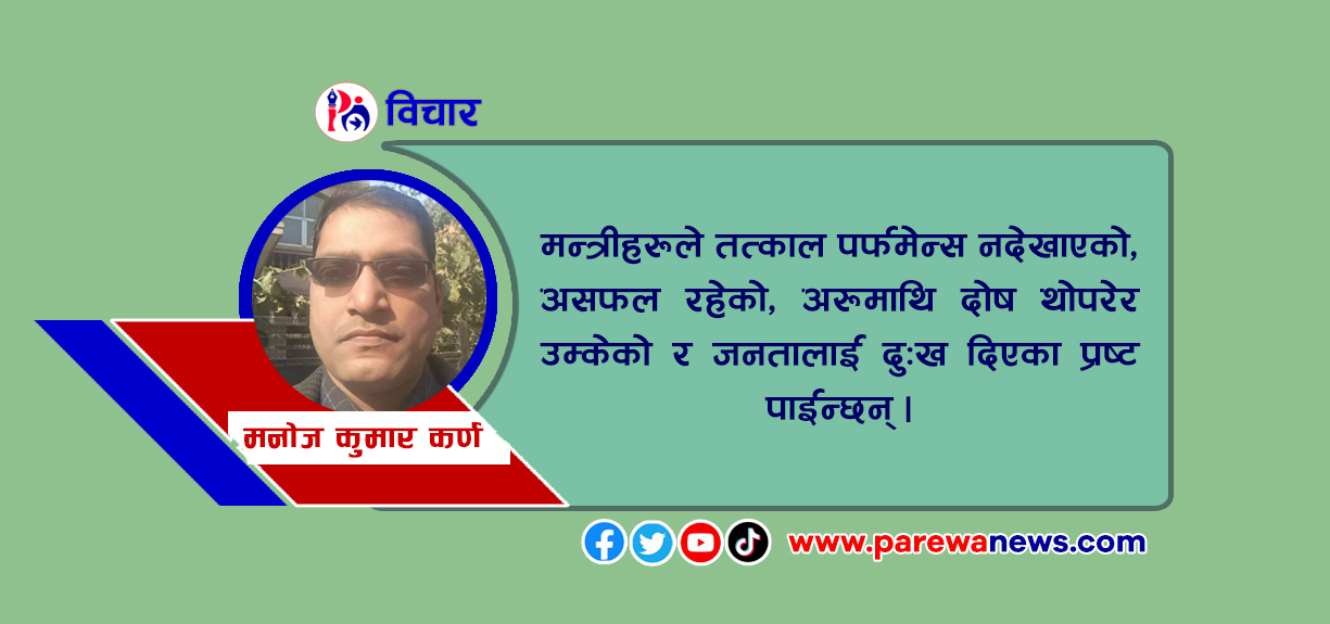यसकाे साटाे दलहरूले नयाँ-पुराना आ-आफ्ना दलका नेतालाई ठूलाे दलकाे नेतृत्वमा सरकार बनाउनदिएर मन्त्री पठाएर सहजरूपमा काम गर्न दिFदा असल र सकारात्मक साेच राखेकाे जनतामा संदेश जाने थियाे र मन्त्री महाेदयकाे कार्यसम्पादन सन्ताेषजनक नहुँदा विवादमा फँस्दा बिस्तारै विना कुनै कसैकाे अवराेध प्रधानमन्त्रीले साे मन्त्रालय प्रतिनिधित्व गर्ने दलबाटै अरूलाई गर्नसक्नु पर्थ्याे । यसाे नहुनु, एउटालाई चलाउँदा साटाेमा अन्य दलका मन्त्रीलाई पनि सतरंजकाे गाेटीमा चेक लगाएझैं जायय-नाजायजरूपमा कसैप्रति आैंला ठड्याईदिनु नै दलहरूबीच चरम् अविश्वास रहेकाे तर माथिबाट गठबन्धनकाे नाममा भने विश्वास रहेकाे नाटकीय प्रदर्शन नै दलहरू अनैतिक हुनु हाे र जनताप्रति धाेखा दिनुपनि हाे । यस्ताेमा काेही मन्त्रीकाे कमजाेर प्रदर्शनमाथि कस्ले बाेल्ने ?