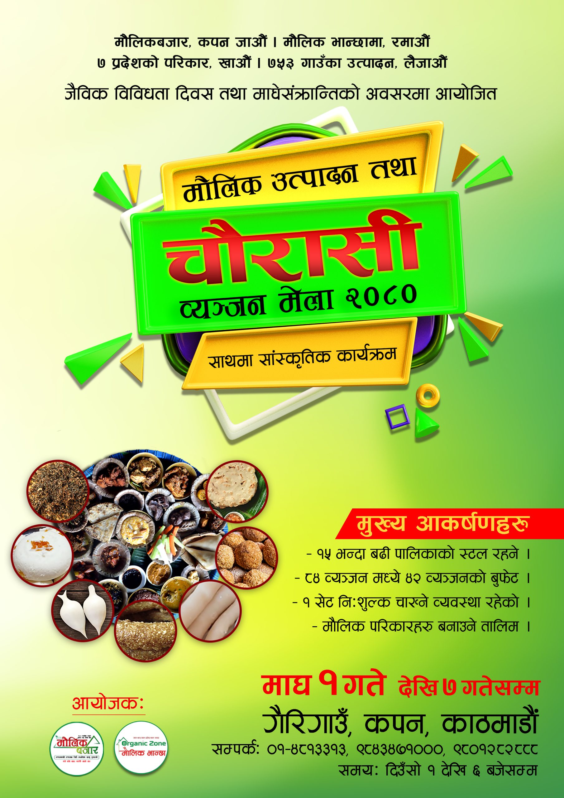मौलिक चाडपर्व, संस्कृति र मौलिक परिकारहरु राष्ट्रिय तथा अन्तर्राष्ट्रिय स्तरमा प्रवर्द्धन गर्ने मौलिक बजार तथा मौलिक भान्छाले यही माघ ७ गते सम्म मौलिक उत्पादन र चौरासी व्यञ्जन मेला आयोजना गरेको हो । कार्यक्रममा माघे संक्रान्ति तथा ७ प्रदेश विशेष परिकार र ८४ व्यञ्जनका साथै सांस्कृतिक कार्यक्रमको साथमा सातै प्रदेशका स्थानिय पालिकाको उत्पादनको स्टल र ४२ व्यञ्जनको बुफेट समेत राखिएको छ।