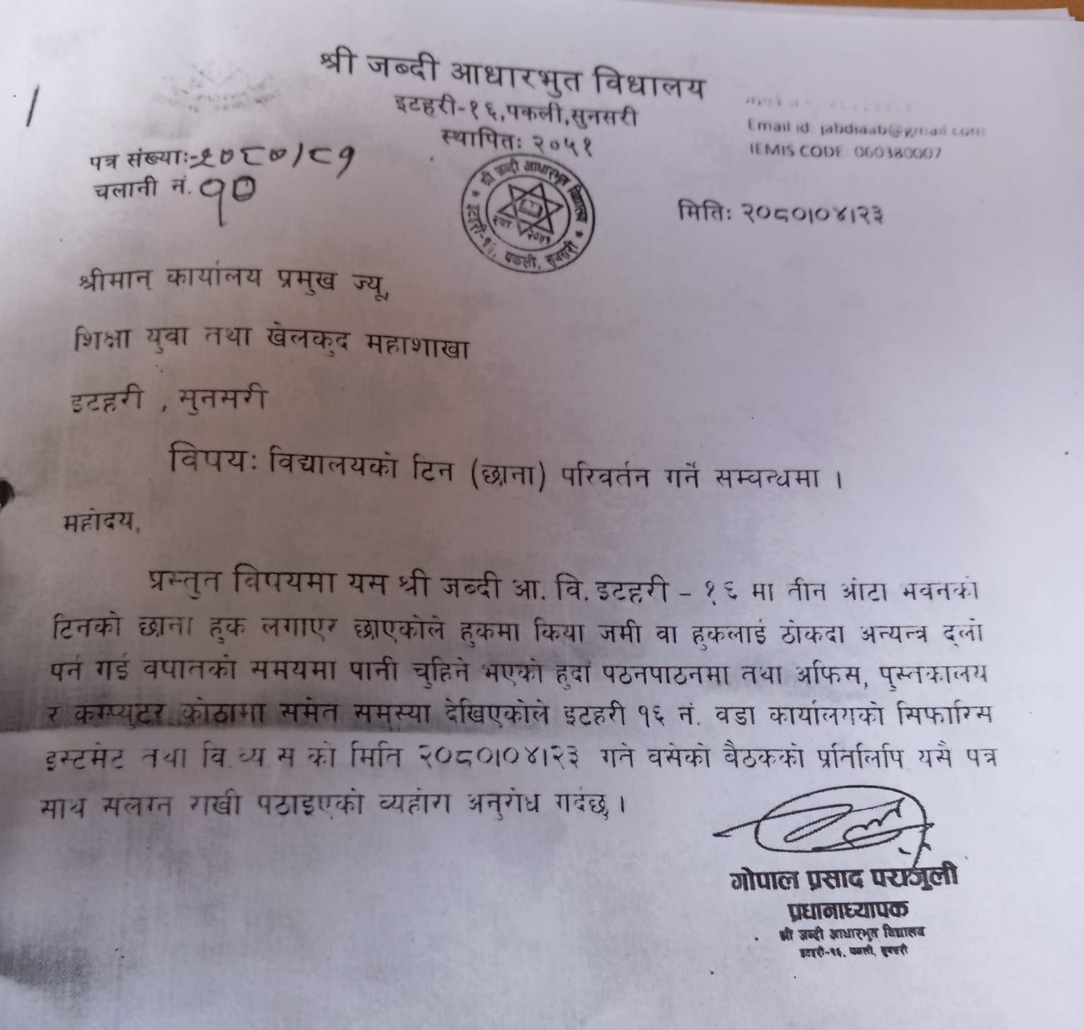 इटहरी,११ माघ। इटहरी उपमहानगरपालिका वडा नं १६ मा रहेको जब्दी आधारभुत बिद्यालयको भौतिक संरचना जिर्ण र नाजुक अवस्थामा पुगेको छ ।