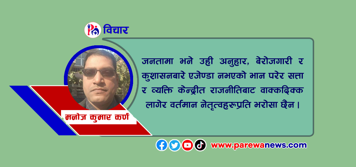 मनोज कुमार कर्णनेपालमा शरद ऋतु समाप्त हुन लाग्दा प्राय: राजनीतिक दलहरूकाे आन्दाेलनकाे काल शुरू हुन्छ र वर्षा ऋतुतिर पुन: कृषि कार्यकाे लागि भनेर स्थगित हुन्छ । यस्ताे जनताकाे नाममा हुने आन्दाेलनकाे हविगत हाे तर साँच्चिकै काेही शीर्ष नेताकाे प्रधानमन्त्री-मन्त्री बन्ने वा ठूलाे तथा प्राप्त मतकाे आधारमा राष्ट्रिय दल कहलिने कुनै ठूला दलले प्रतिपक्षमा जाने बित्तिकै उक्त दलका नेताहरूकाे सरकार नढालुञ्जेल भने वर्षै दिन आन्दाेलनकाे माैसम रहन्छ किनकि त्यस बखत राजनीतिकाे नाममा हुने लाभार्थी जनताबाट स्वयं नेता हुनपुग्छन् ।