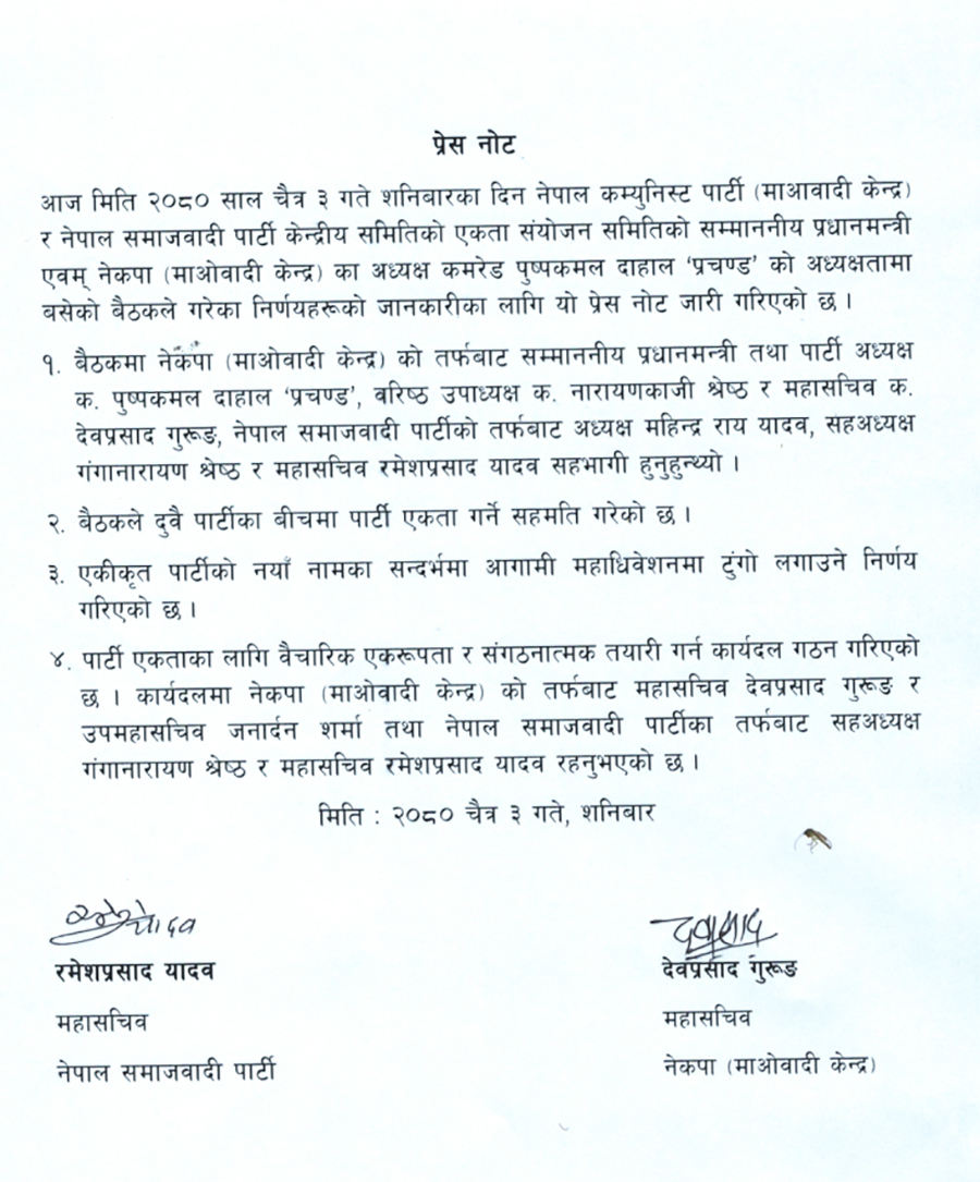 पार्टी एकताका लागि वैचारिक एकरुपता र संगठनात्मक तयारीका लागि कार्यदल गठन गरिएको छ । कार्यदलमा माओवादीको तर्फबाट महासचिव देवप्रसाद गुरुङ र उपमहासचिव जनार्दन शर्मा तथा नेसपाबाट सहअध्यक्ष गंगानारायण श्रेष्ठ र महासचिव रमेशप्रसाद यादव रहेका छन् ।