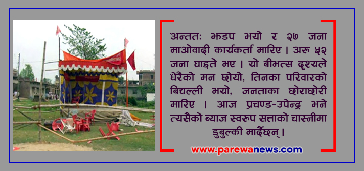 त्यो घटना हुने पुर्व संकेत प्रचण्ड,उपेन्द्र,मातृका वा अन्य तिनका नेताकार्यकर्तालाई पक्कै थियो। एकै मिति,समय र स्थानमा दुई पक्षको कार्यक्रम हुने भएपछि त्यहाँ गडबड हुने नीश्चित थियो । यसैले दुवै पक्षलाई स्थानीय प्रशासनले समय नजुधाउन भन्यो । तर दुवै पक्षले मानेनन् । अन्ततः झडप भयो र २७ जना माओवादी कार्यकर्ता मारिए। अरु ५२ जना घाइते भए। यो बीभत्स दृश्यले धेरैको मन छोयो,तिनका परिवारको बिचल्ली भयो,जनताका छोराछोरी मारिए ।तर,त्यै घटनाका योजनाकार,आयोजक जे भने पनि माओवादी र मधेसी जनअधिकार फोरम(अहिलेको जसपा) ले कुनै दु:ख मानेनन् बरु उल्टै सत्ताको चास्नीमा डुबुल्की मार्दै रहे।