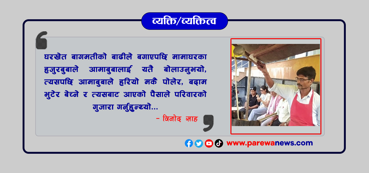 ‘घरखेत बागमतीको बाढीले बगाएपछि मामाघरका हजुरबुबाले आमाबुबालाई यतै बोलाउनुभयो’, उनले भने, ‘त्यसपछि आमाबुबाले हरियो मकै पोलेर, बदाम भुटेर बेच्ने र त्यसबाट आएको पैसाले परिवारको गुजारा गर्नुहुन्थ्यो।’