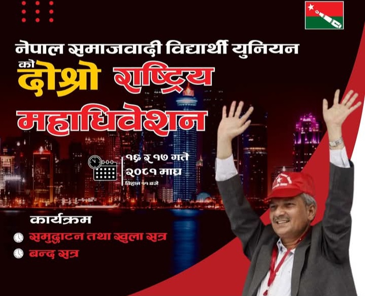 काठमाडौं । नेपाल समाजवादी विद्यार्थी युनियनको दोस्रो राष्ट्रिय महाधिवेशन बुधबारदेखी काठमाडौंमा सुरु हुँदैछ। महाधिवेशन २ दिनसम्म चल्नेछ।