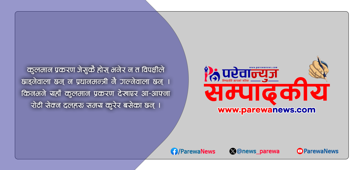 कुलमान प्रकरणमा प्रधानमन्त्रीले जवाफ नदिएसम्म संसद् चल्न नदिने विपक्षीको माग छ । अर्कोतिर जवाफ नदिने प्रधानमन्त्री केपी शर्मा ओलीको अडान छ। अनि प्रभावित हुन पुग्छ संसद् बैठक । कुलमान प्रकरण जेसुकै होस् भनेर न त विपक्षीले छाड्नेवाला छन् न प्रधानमन्त्री गल्नेवाला छन् । किनभने यहाँ कुलमान प्रकरण देखाएर आ-आफ्ना रोटी सेक्न दलहरू समय कुरेर बसेका छन् । देश जता जाओस् र जनता जेसुकै गरुन् कसैलाई केही मत्लब छैन।
