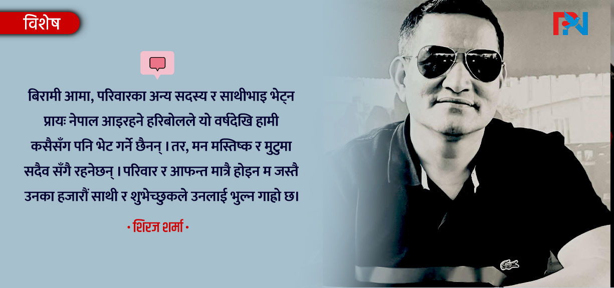शिरज शर्माअसल मानिसलाई आफ्नो भन्दा देशको बढी चिन्ता र चासो अनि साथीभाइको बढी माया हुन्छ। अझ देशभन्दा टाढा छ भने उसको परिवार र मातृभूमि प्रतिको माया अपार हुन्छ, बेजोड हुन्छ र त्यसलाई कुनै यन्त्रले मापन नै गर्न सकिन्न । यो उसको गुण हो,स्वभाव हो र संस्कार पनि हो।