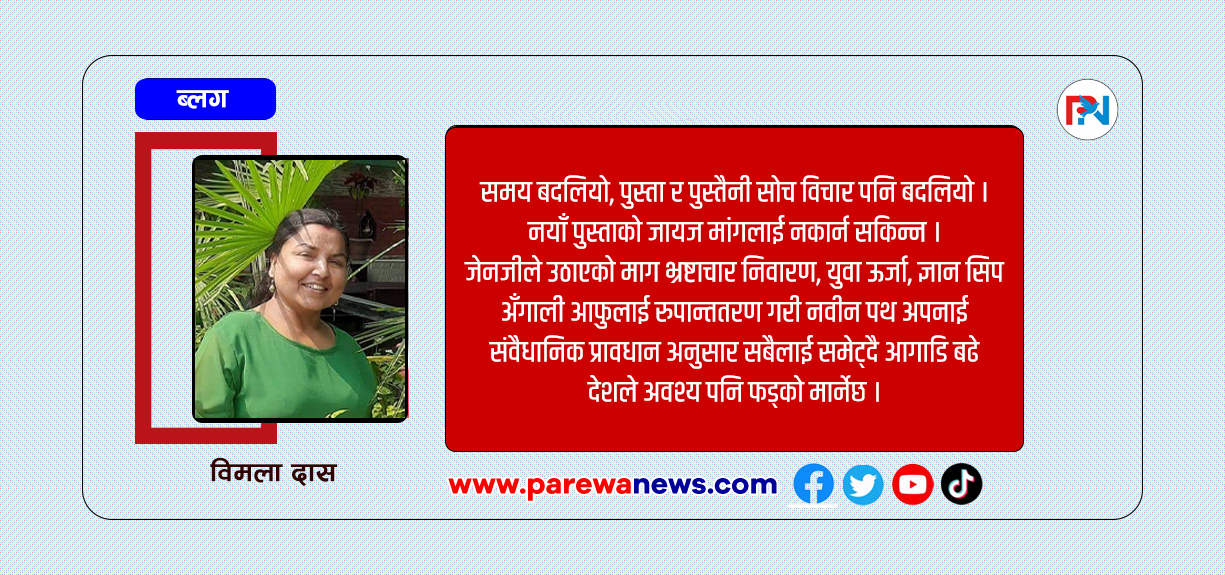 समय बदलियो, पुस्ता र पुस्तैनी सोच विचार पनि बदलियो । नयाँ पुस्ताको जायज मांगलाई नकार्न सकिन्न । जेन जिले उठाएको माग भ्रष्टाचार निवारण, युवा उर्जा, ज्ञान सिप अँगाली आफुलाई रुपान्ततरण गरी नवीन पथ अपनाई संवैधानिक प्रावधान अनुसार सबैलाई समेट्दै आगाडि बढे देशले अवश्य पनि फड्को मार्नेछ । यसरी नयाँ सिप र उर्जाका साथ काम गर्यौं भने विकासको बाटो मा जेन जि आन्दोलन अविश्वसनीय हुनेछ ।