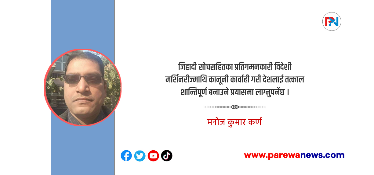 नेपालमा जिहादी गतिविधि र देशकाे राष्ट्रिय झण्डाकाे दुरूपयाेग भित्रभित्रै धेरै लामाे समयदेखि सूक्ष्मरूपमा हुँदै आईरहेकामा यसकाे मुखाैटा हटेर प्रस्टरूपमा २०८२ भदाै २३ गतेकाे जेनजी विद्राेह र भाेलीपल्ट २४ गतेकाे आतंक र विध्वंसबाट देखिएकाे हाे ।