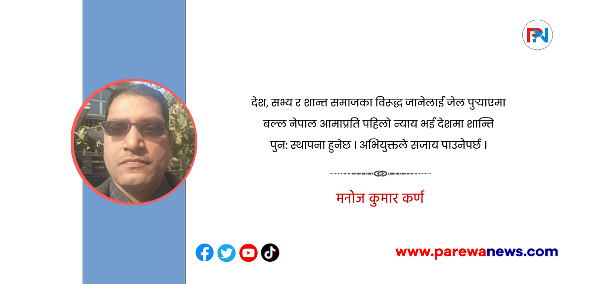 अन्तत: देश, सभ्य र शान्त समाजका विरूद्ध जानेलाई जेल पुर्याएमा बल्ल नेपाल आमाप्रति पहिलाे न्याय भई देशमा शान्ति पुन: स्थापना हुनेछ । अभियुक्तले सजाय पाउनैपर्छ, द कल्प्रिट मस्ट बी पनिश्ड ! जय नेपाल !